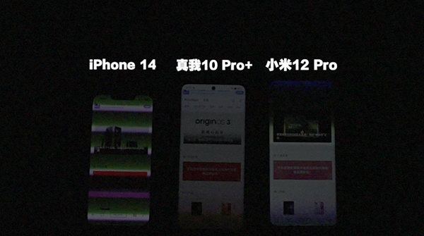 通過相應(yīng)對比實測,我們可以看到超高頻調(diào)光的厲害之處。使用其他機型與真我10 Pro+進(jìn)行對比,在相同快門速度下,同時給手機設(shè)置高、中、低三種亮度進(jìn)行測試,最終呈現(xiàn)以下畫面,并得到結(jié)論:真我10 Pro+的頻閃幅度微乎其微,甚至與旁邊的對比機型之間存在有比較明顯的差異。尤其是到低亮度時,兩旁的手機畫面已被頻閃覆蓋,相機已比較難收錄內(nèi)容,但真我10 Pro+仍然能較為清晰地顯現(xiàn)內(nèi)容。