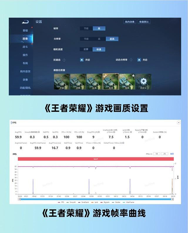在實際的游戲性能測試中,我們首席測試了國民級手游《王者榮耀》。在畫質(zhì)選項設置為高清畫質(zhì)+高幀率,測試場景為5V5對戰(zhàn)測試。真我10 Pro單局游戲的實測平均幀率為59.9幀,全程沒有出現(xiàn)大幅度降幀現(xiàn)象,這表明真我10 Pro可以實現(xiàn)滿幀游戲體驗,這一成績在當下同價位的智能手機當中當優(yōu)秀。