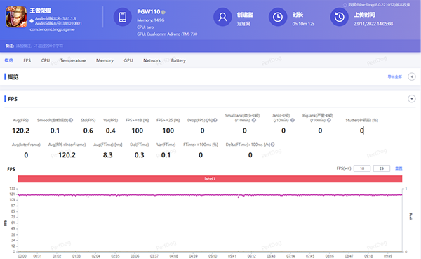 實際游戲體驗方面,筆者首先采用《王者榮耀》進行測試,畫面設置為:幀率極高120Hz、分辨率超高,關閉動態(tài)分辨率。在一局10分鐘5V5的比賽當中,OPPO Reno9 Pro+全程跑滿120幀,機身溫度還不到37°C,表現(xiàn)可以說是毫無壓力。