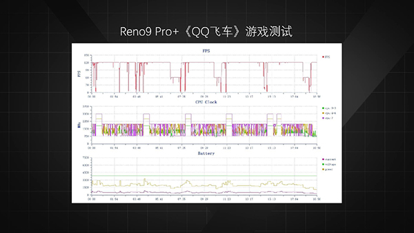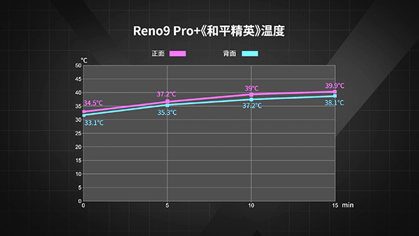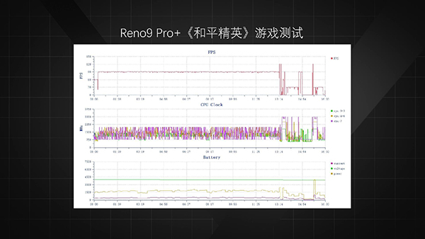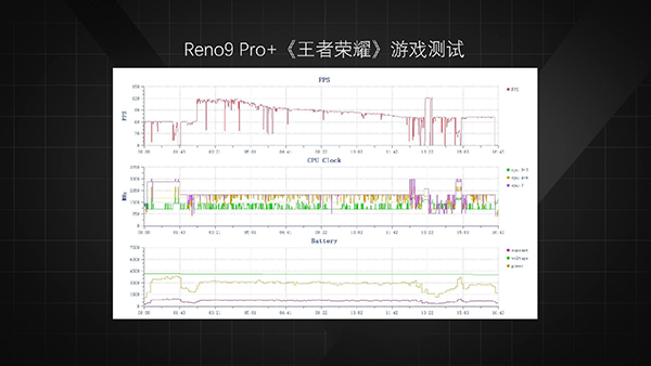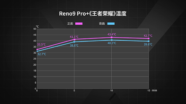 在《王者榮耀》中,Reno9 Pro+可以開啟120Hz模式,但后段掉幀幅度較大,去掉過場動畫等低幀率場景后,平均幀數(shù)僅有86,正面溫度最高42.7℃,背面溫度最高39.6℃,功耗3.87W。