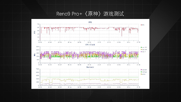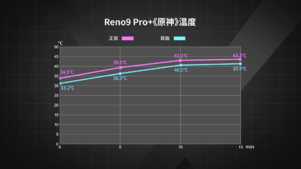 Reno9 Pro+在《原神》中的表現(xiàn)不錯,幀率保持很穩(wěn),只有在一些復雜場景時才會出現(xiàn)一點掉幀,它的平均幀率為57幀,正面溫度最高43.3℃,背面溫度最高40.9℃,由于系統(tǒng)對芯片進行了降頻處理,功耗僅有3.05W。