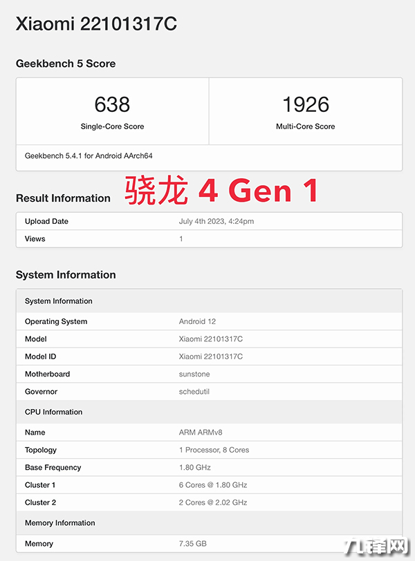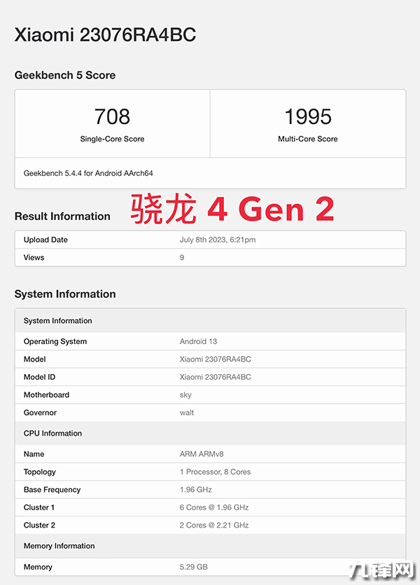 而有關(guān)這個(gè)驍龍4Gen2的Geekbench5成績(jī)出爐,機(jī)型是Redmi Note12R,型號(hào)23076RA4BC,單核708分,多核1995分。