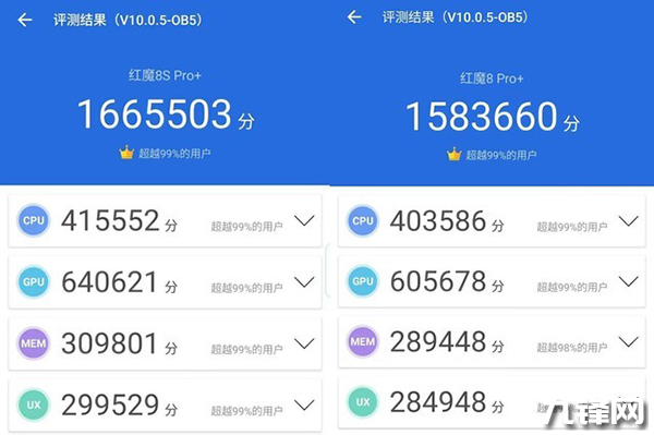 我選擇了搭載驍龍8Gen2領(lǐng)先版的紅魔8S Pro+和搭載驍龍8Gen2的前代機型紅魔8 Pro+,話不多說,我們先對這兩臺手機跑個分。