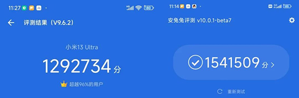 小米13 Ultra中跑分129萬分,在iQOO 11S中跑分為129萬分