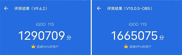 從跑分上看,V9和V10的跑分差別還是挺大的,iQOO 11S在V10中的跑分特別高,在V9中的中跑分確不并高,可見在V10中的某些項(xiàng)目測試上iQOO 11S占了一些優(yōu)勢的,現(xiàn)在很多的手機(jī)都以這個(gè)最新的V10跑分為主了。