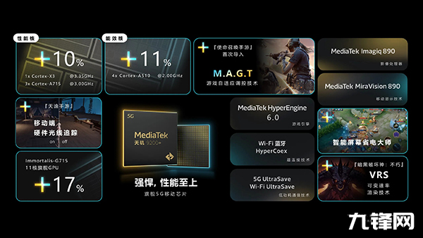 其實這個天璣9200+也叫天璣9200超頻版,在具體的配置上,聯(lián)發(fā)科天璣9200+處理器采用了臺積電先進的第二代4nm制程,搭載基于Armv9的1+3+4三叢集架構(gòu)。CPU由一個主頻3.35GHz的Cortex-X3超大核和3個主頻3.0GHz的Cortex-A715大核和4個Cortex-A510能效核心組成,GPU則是11核的Immortalis-G715核心,綜合實力非常強大。