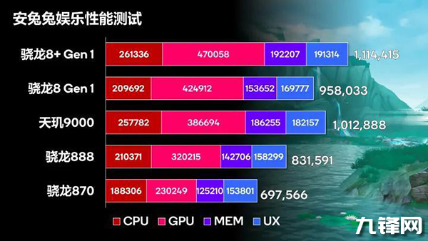 在安兔兔的跑分測(cè)試中,驍龍8+Gen1的跑分穩(wěn)定在110萬(wàn)分以上,而驍龍8 Gen 1和天璣9000也基本是在100萬(wàn)分左右,而且可以看到驍龍8+ Gen 1在CPU/GPU和UX部分上相對(duì)驍龍8 Gen 1性能都有明顯的提升。