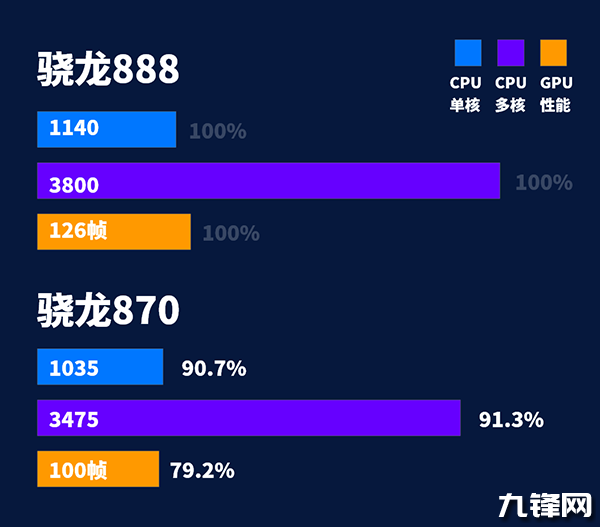 那么驍龍870和驍龍888的性能差距有多大,如下圖所示: