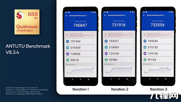 高通共使用驍龍888參考設(shè)計(jì)樣機(jī)進(jìn)行了三次安兔兔跑分,成績(jī)分別是740847、731916以及733554。