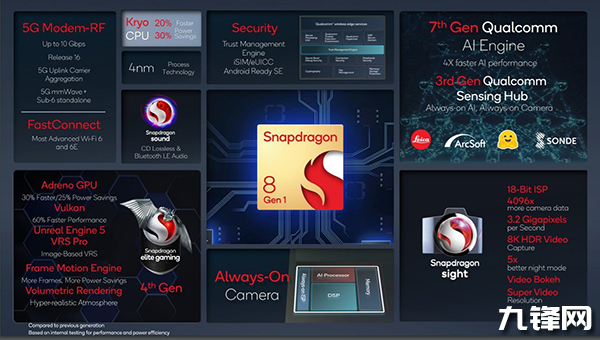 在這個具體的規(guī)格上,高通驍龍8Gen1采用了三星4nm工藝制程,CPU部分采用1個Cortex-X2超大核,頻率3.0GHz,3個Cortex-A710大核,頻率2.5GHz,4個Cortex-A510小核,頻率1.8GHz,也就是全部基于ARMv9純64位指令集打造的8核Kryo,CPU性能提升20%。能耗最高減少30%。GPU采用了Adreno730,相較上一代驍龍888的Adreno660,性能提升30%,能耗減少25%。