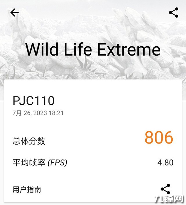 在體現(xiàn)GPU性能的3DMark Wild Life EXTREME測(cè)試中,驍龍782G取得到了806分的成績。