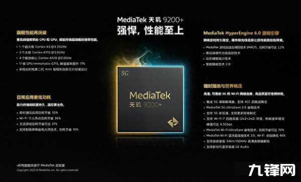 天璣9200+處理器采用臺(tái)積電第二代4nm制程打造,也是1+3+4的八核CPU架構(gòu),包括一顆3.35GHz的Cortex-X3超大核,三顆3.0GHz的Cortex-A715大核,四顆2.0GHz的Cortex-A510小核,GPU為Immortalis-G715。