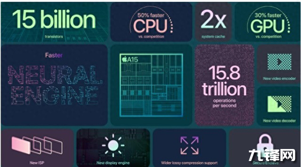 蘋果A15是臺(tái)積電5納米工藝,采用的是2+4的CPU核心架構(gòu)設(shè)計(jì),包括2*3.23Ghz高性能核心+4*2.02Ghz低功耗核心,16MB L2緩存,5核心GPU 600Mhz主頻,16核心APU芯片。