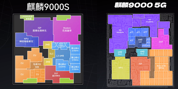 麒麟9000S的CPU采用8核心設計,具體是1個2.62GHz的超大核心+3個2.15GHz的大核心+4個1.5GHz的A510小核心,支持超線程,因此其CPU實現(xiàn)了8核心12線程,L3緩存4MB,系統(tǒng)緩存4MB,GPU為Maleoon 910,GPU頻率750MHz。