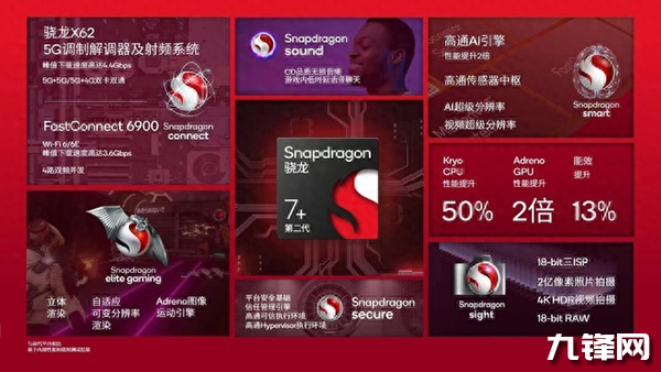 驍龍7+Gen2(也叫第二代驍龍7+)是臺積電4nm工藝,采用的是1+3+4的八核心架構(gòu)設(shè)計,包括1個2.9GHz的Cortex-X2核心、3個2.5GHz的Cortex-A710核心、4個1.8GHz的Cortex-A510核心,GPU為Adreno 725。