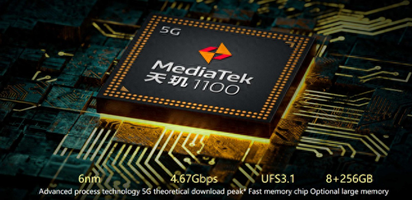 天璣1100是臺積電6nm工藝,是4+4的八核心架構設計,包括4個2.6GHz的Cortex-A78大核心和4個2.0GHz的Cortex-A55小核心,GPU是ARM G77 MC9