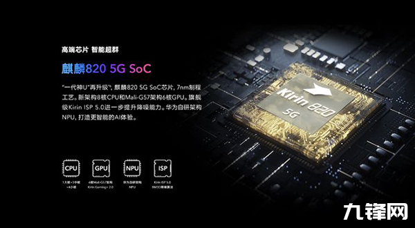 麒麟820采用的是臺積電7nm工藝,并且是1+3+4的八核心架構設計,包括一個2.36GHz Cottex-A76大核、3個2.2GHz Cortex-A76中核、4個1.8GHz的Cortex-A55小核,GPU升級到了Mali G57 MC6。