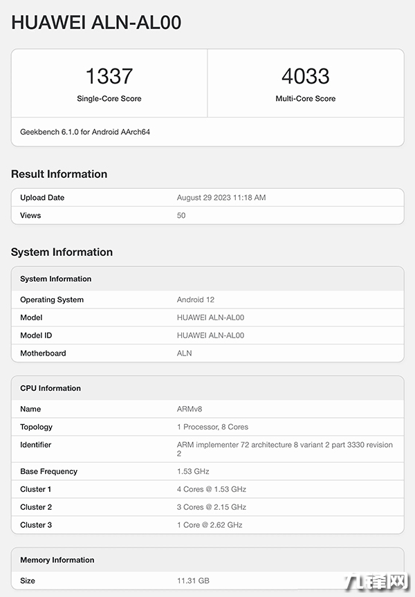 華為Mate60 Pro搭載的麒麟9000S在Geekbench6中單核為1337分、多核為4033分;