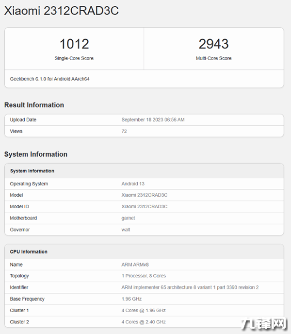 小米Civi 2(驍龍7Gen1),單核1026分,多核2932分;