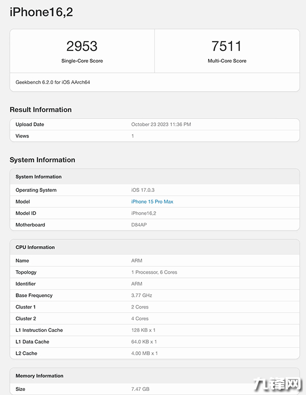 我們再對比一下蘋果iPhone 15 Pro Max跑分,搭載臺積電3nm打造的A17 Pro處理器,單核2953分,多核7511分。