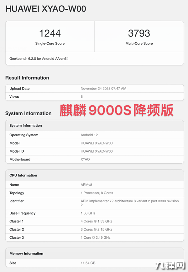 從跑分上來看,這個麒麟9000S降頻版在GeekBench 6單核成績1244分,多核成績3793分。