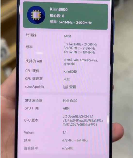 麒麟8000參數(shù)和架構(gòu):采用的是1+3+4的八核心架構(gòu)設(shè)計(jì),1×2.4GHz 大核,3×2.189GHz 中核,4×1.84GHz Cortex-A55 小核,GPU是Mali-G610 864MHz。