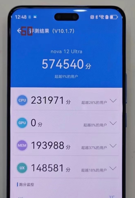 這次的華為nova12 Ultra就是首發(fā)搭載的麒麟9000SL,根據(jù)跑分來(lái)看,CPU部分安兔兔57W+,GPU依舊無(wú)法識(shí)別,如果加上GPU的分?jǐn)?shù)的話(huà),跑80萬(wàn)分左右是沒(méi)有問(wèn)題的。