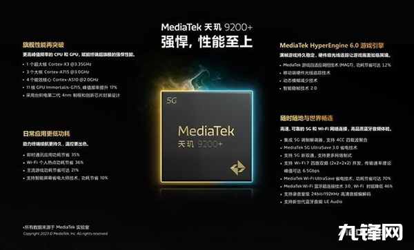天璣9200+采用臺積電第二代4nm工藝,八核CPU性能得到全方位提升,Cortex-X3超大核,主頻高達3.35GHz;Cortex-A715大核,主頻高達3.0GHz;Cortex-A510能效核心,主頻為2.0GHz;Immortalis-G715GPU,峰值頻率提升可達17%。