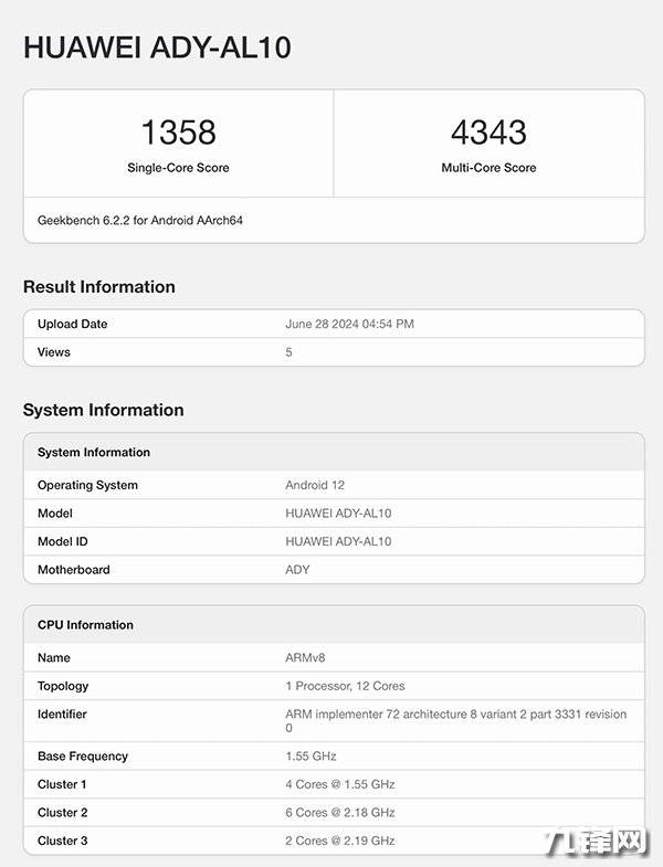 我們要看跑分的話,在Geekbench6,麒麟9010E處理器單核性能跑分是1358,多核性能跑分是4343,與麒麟9010相比,稍微弱了一點,麒麟9010單核是1442分,多核是4471分。