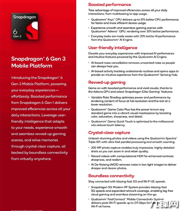 驍龍6Gen3還支持AI功能、LPDDR4x/5 RAM、UFS 3.1存儲,并兼容Wi-Fi 6E(最高2.9Gbps)、藍牙5.2、USB 3.1。