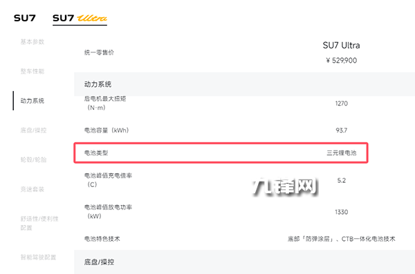 三元鋰電池,小米SU7 Ultra采用寧德時(shí)代的麒麟三元鋰電池,電池容量為93.7kWh。