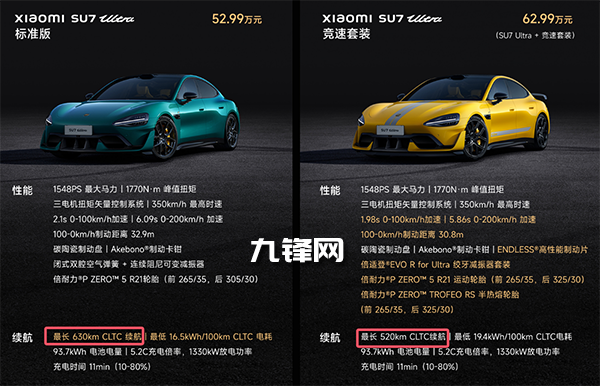標(biāo)準(zhǔn)版是630km CLTC續(xù)航,競速套裝版是520km CLTC續(xù)航。