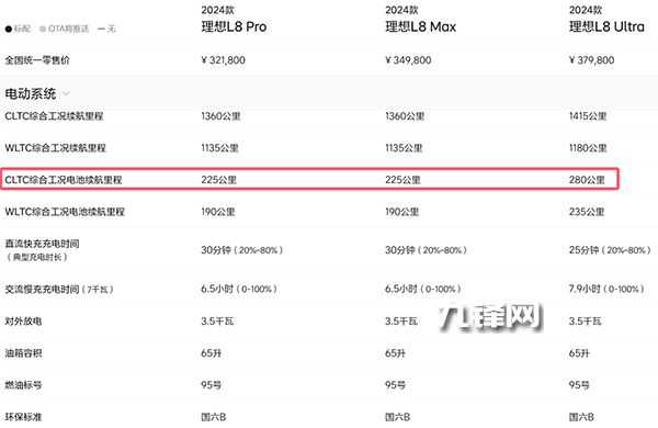 2024款的理想L8 Pro和Max的CLTC純電續(xù)航里程是225公里,而Ultra版本的CLTC純電續(xù)航里程是280公里。