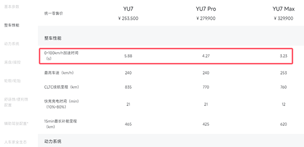 標(biāo)準(zhǔn)版YU7是5.88秒,YU7 Pro是4.27秒,YU7 Max是3.23秒。
