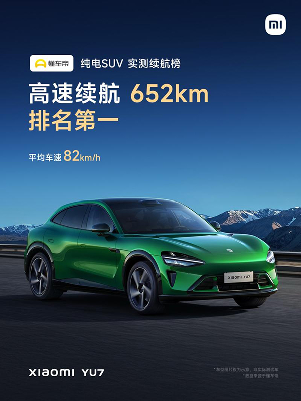 而在懂車帝的測試中,小米YU7的實測高速續(xù)航里程為652km,排名第一,如果按這個成績計算,YU7的高速續(xù)航達成率為78%。