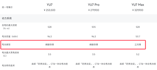 小米YU7和小米YU7 Pro是磷酸鐵鋰電池,而小米YU7 Max則是三元鋰電池。