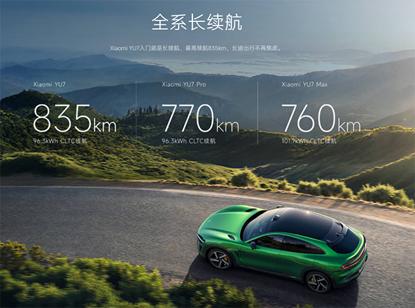 YU7超長續(xù)航高性能四驅(qū)Max版:雙電機(jī)高性能四驅(qū),0-100公里/小時(shí)加速時(shí)間3.23秒,峰值功率508千瓦,峰值扭矩866牛·米,最高車速253公里/小時(shí),匹配101.7千瓦時(shí)電池組,CLTC續(xù)航里程760公里,支持5.5C最大充電倍率。