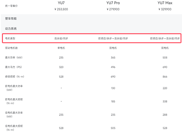 小米YU7是單電機(jī)后驅(qū)動(dòng)力系統(tǒng),而小米YU7 Pro和小米YU7 Max搭載雙電機(jī)四驅(qū)動(dòng)力系統(tǒng)。