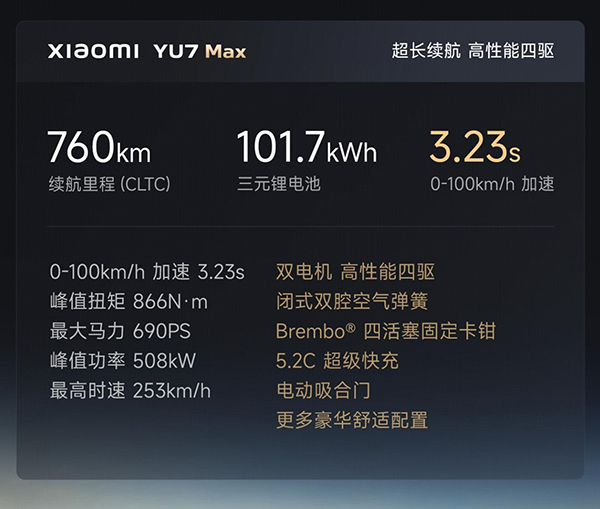 小米YU7標(biāo)準(zhǔn)版是單電機(jī)后驅(qū)動力系統(tǒng),而小米YU7 Pro和小米YU7 Max搭載雙電機(jī)四驅(qū)動力系統(tǒng)。