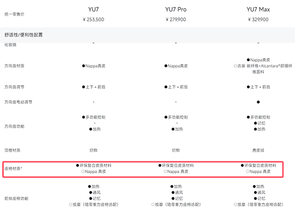 不是,小米YU7全系列默認(rèn)配置的都是環(huán)保復(fù)合皮質(zhì)材料,并不是Nappa真皮材質(zhì),不過(guò)可以單獨(dú)選裝Nappa真皮材質(zhì)的座椅。