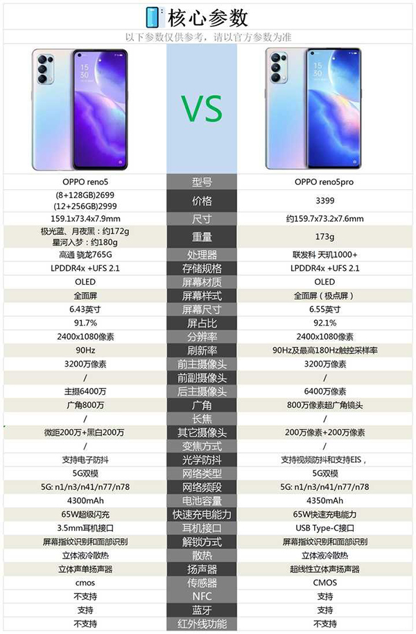 OPPO Reno5和OPPO Reno5 Pro這兩款手機的核心配置對比情況,請參考下圖。