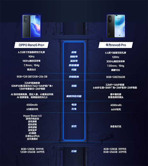 再說(shuō)說(shuō)性能方面,OPPO Reno5 Pro+搭載驍龍865芯片,華為nova8 Pro搭載麒麟985芯片,雖然都是7nm制程工藝,但是性能上還是OPPO更勝一籌,而且OPPO Reno5 Pro+支持最高12GB運(yùn)存,性能上限會(huì)更高。