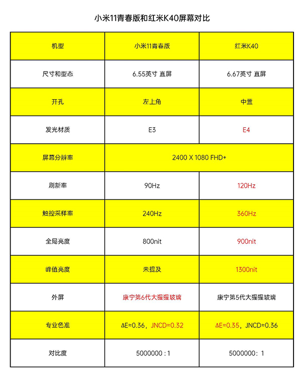 不比不知道,一比嚇一跳,從上圖11項(xiàng)屏幕參數(shù)對(duì)比來(lái)看,小米11青春版這塊原色屏在兄弟旗艦紅米K40面前,被秒成了渣,發(fā)光材質(zhì)、刷新率、觸控采樣率、全局亮度等都有所有不如。