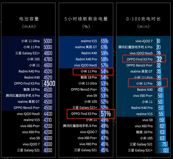 最后在續(xù)航方面,OPPO Find X3 Pro和小米11 Pro都是采用了大容量電池,前者為4500mAh,后者則是5000mAh。雖然有著500mAh的電池差距,但是根據(jù)WHYLAB的數(shù)據(jù)顯示,在同等測(cè)試環(huán)境下,小米11 Pro剩余電量?jī)H僅比OPPO Find X3 Pro高出3%,這樣的差距在日常使用幾乎是可以忽略不計(jì)的。而在快充方面,小米11 Pro支持67W有線快充,OPPO Find X3 Pro則支持65W超級(jí)閃充,實(shí)際快充表現(xiàn)雙方也是難分伯仲。