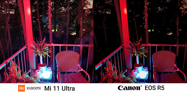 第一組照片的拍攝環(huán)境是在夜間,小米11 Ultra和佳能EOS R5拍攝的對象是凳子,唯一的發(fā)光源是茶幾上的小燈。小米11 Ultra拍攝的照片整體的亮度較高,比如椅子靠背上的紅色和黑色的紋路也是比較清楚地辨認(rèn)出來,并且欄桿后面的柱子也可以清晰可辯的。佳能EOS R5拍攝的照片中亮度較暗,椅子靠背的紅黑紋路有些模糊,同時院子后方中間的柱子已經(jīng)看不到了。