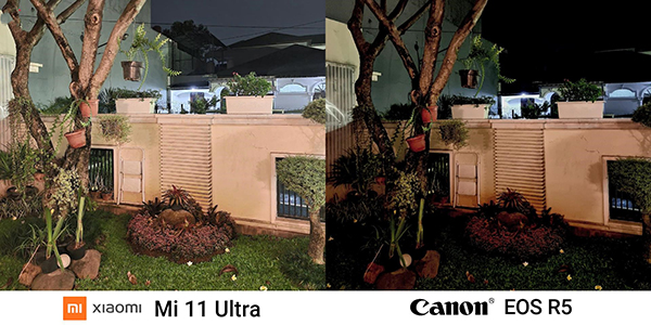 第二組照片的拍攝環(huán)境還是在夜間,在照片的亮度表現(xiàn)上,小米11 Ultra拍攝的照片整體亮度較高,無論是建筑物表面,還是院子內(nèi)部的草地,包括建筑物旁邊的花叢,都可以很清楚的辨認(rèn)出來,而且照片上方的建筑物和天空之間也是可以區(qū)分出來的。佳能EOS R5拍攝的照片中,亮度要比小米11 Ultra低不少,建筑物表面是亮的,但是院子內(nèi)部的花叢和樹干等部分難以區(qū)分。