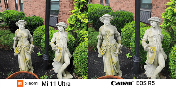 第三組照片的拍攝環(huán)境是在白天的室外,光線應(yīng)當(dāng)說還是非常充足的。小米11 Ultra和佳能EOS R5之間的區(qū)別并不是在曝光度方面,而是在一些細(xì)節(jié)方面。小米11 Ultra拍攝的照片中的雕塑面部,還有部分樹葉,出現(xiàn)了曝光過度的現(xiàn)象,部分樹葉的亮度過高導(dǎo)致模糊不清楚,而雕塑面部局部出現(xiàn)反光嚴(yán)重。佳能EOS R5拍攝的照片中,整體的曝光度則表現(xiàn)不錯,無論是人物還是樹葉的細(xì)節(jié)表現(xiàn)都比較清楚。