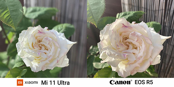 第四組拍攝的主體是白色的花朵,在光線的照射下,小米11 Ultra拍攝的花朵給人的感覺更白一些,但是佳能EOS R5拍攝的花朵給人的感覺是層次感更強(qiáng)一些。另外在背景虛化效果的區(qū)別上,小米11 Ultra拍攝的背景虛化效果更明顯,佳能EOS R5拍攝的花朵背景虛化效果則沒有小米11 Ultra虛化得好,背景的柵欄都是可以清晰可見的,這可能是拍攝的設(shè)置問題。