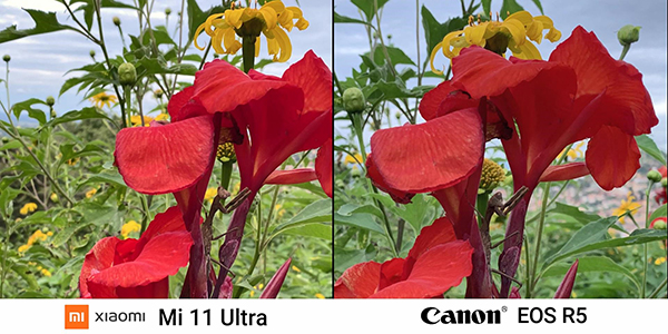 第五組照片中的被拍攝主體是花朵,不過這次是紅色的花朵。小米11 Ultra的照片依然十分明亮,紅色的花朵表現(xiàn)得更加鮮艷,佳能EOS R5拍攝的花朵則有些暗,所以花朵的紅色變得不夠鮮艷。不過小米11 Ultra和佳能EOS R5除了紅色的花朵在明暗程度上的區(qū)別之外,綠葉和天空的亮度卻非常接近,差距并不是很大。