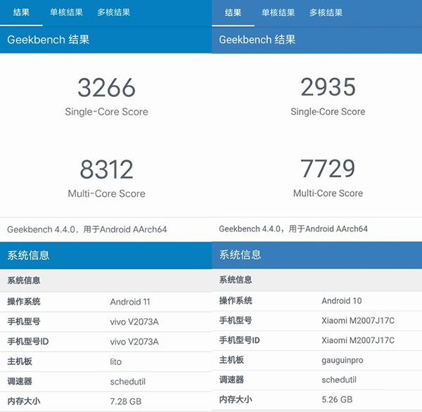 GeekBench成績(jī)(左iQOO Z3,右Redmi Note9 Pro)